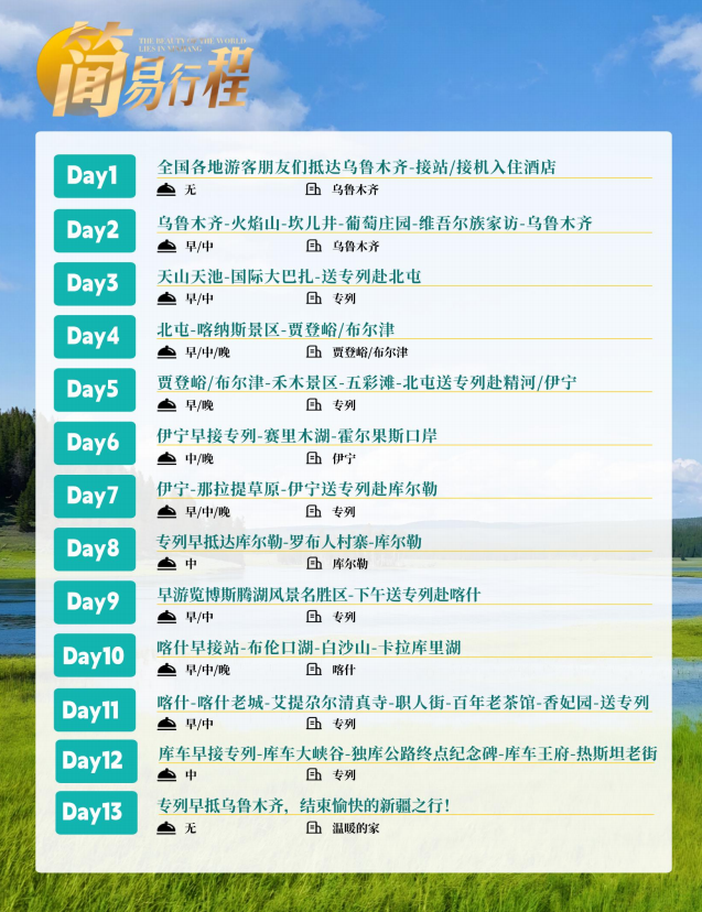 乌鲁木齐—天山天池(单程约 80KM,行车约 1.5 小时)—国际大巴扎(单程约 80KM, 行车约 1.5 小时)—专列赴北屯