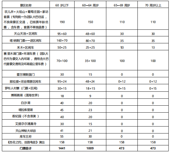 下表各景点门票价格为参考价格 ,门票及老年优 惠政策以景区当天实际价格为准 ,届时多退少补 ;具体景区以实际游览为准。