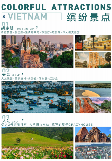 早餐后,前往【大叻】,美丽浪漫的大叻被誉为越南私藏的法国,城里密布着色 彩鲜艳的法国老别墅,街道两 旁总是花团锦簇,湖泊和森林使得大叻一年四季气候都很舒适宜人。前往参观【保大3号避暑行宫】(游览时间 不少于30分钟)这个行宫建于 1933年,是越南末代皇帝保大的避暑行宫。行宫周围是美丽的园林,虽然外表并 不起眼,但内部装饰极 尽奢华盾。整个夏宫是一个有围墙的大院,一座浅黄色的平顶砖石结构的二层楼,线条 清晰简洁。室内设备,包括家具和床上用品等等,都保持完好。