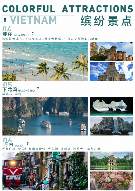 早餐后,游览被世界教科文组织称为世界文化遗产的“海上桂林”-下龙湾风光(约 4 小时含午餐时间),其范 围非常广泛,面积约有一千五百平方公里,其中散布超过一千六百座石林及石旬状的小岛,乘船绕行其中,体验 大自然的鬼斧神工之妙,乘船参观下龙湾的标志景点【斗鸡石】(游览时间不少于15分钟)等,中餐在船上品尝 船家为您准备的『小海鲜餐』,您也可以自由向穿梭在海上的渔民选购您喜爱的鱼大快朵颐一番。接着带您登陆 岛上一窥究竟,观赏天然的【溶洞】(游览时间不少于15分钟)奇观,洞内充满钟乳石奇景。随后乘船返回码 头,后驱车返回河内车程约3.5 小时,(河内-下龙湾路 程较远,中途会在休息站停留,以便客人如厕休整,注意 此处仅供休息和方便使用,如购物为个人自主行为。)参观河内城市广场【巴亭广场】(游览时间不少于30分 钟)、外观【胡志明主席府】,车观最为耀眼的【中国驻越南大使馆】、打卡河内网红【火车街】(游览时间不 少于15分钟),后前往【还剑湖】(游览时间不少于15分钟)、由一根石柱撑起的【独柱寺】(游览时间不少 于30分钟)赠送特色电瓶车游【三十六条古街】(游览时间不少于30分钟)(赠送项目如因时间、天气等客观 因素无法安排则费用不退);入住酒店休息。