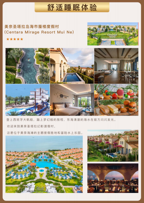 早餐后前往负有盛名的美奈【红沙丘】(游览时间不少于30分钟),红沙丘是一片热情的土地,沙漠的深处有淡 水湖泊,湖泊旁长满了高大幽深的热带丛林植被。红白相间的沙丘包裹着碧湖绿树,湖上飘着朵朵荷花。风吹荷 浪翻涌,岸边丛林树梢沙沙作响,沙粒流动无痕。一副那么不和谐却又那么真实的美景在你面前,使你有着无法 形容 的激动!特别赠送【滑沙体验】(赠送项目如因时间、天气等客观因素无法安排则费用不退)。接着参观