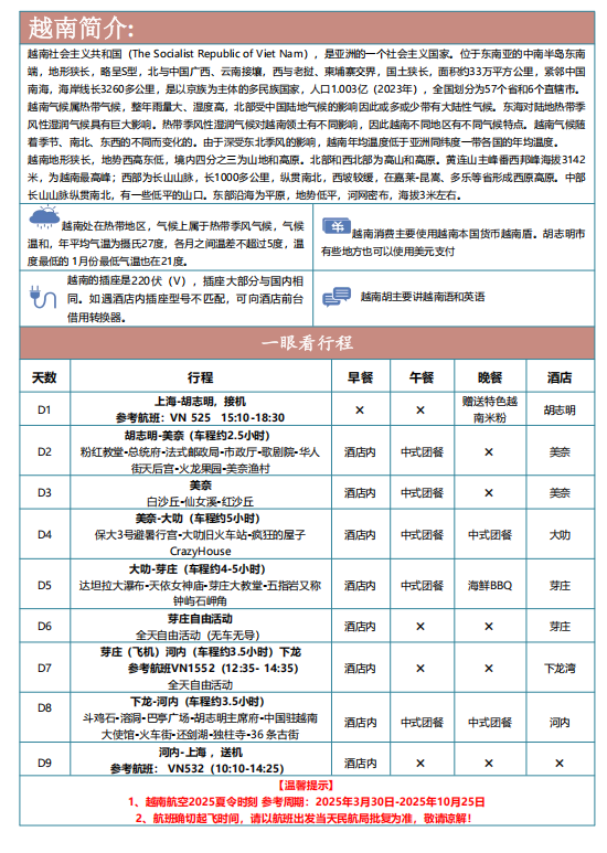 上海浦东机场搭乘航班飞往越南-胡志明市。旧称“西贡”曾是法国殖民地,有【东方小巴黎】之称。抵达后由 导游迎接各位贵宾,随即带领各位入住酒店休息。特别赠送【品尝越南特色米粉】(赠送项目如因时间、天气等 客观因素无法安排则费用不退)