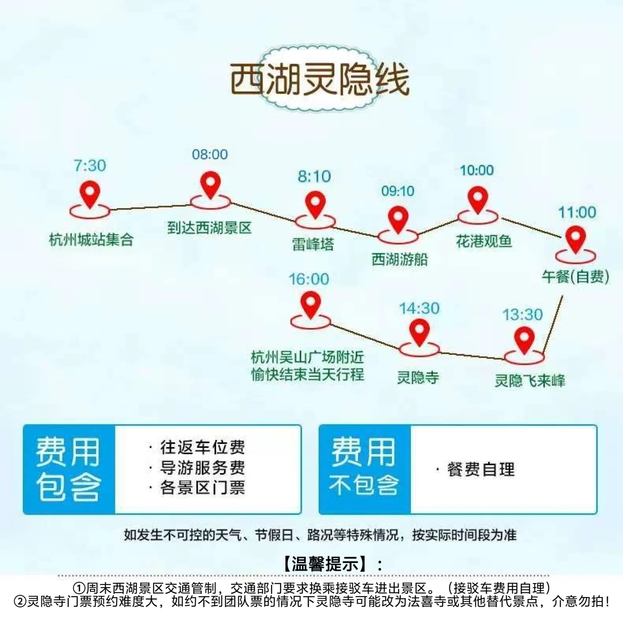 ②周末灵隐寺门票可能难约,如约不到团队票的情况下灵隐寺可能改为法喜寺或其他替代景点,介意勿拍!