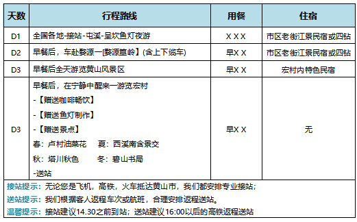 特别赠送景点:春季-卢村油菜花(不进村) 夏季-西溪南 秋季-塔川秋色 冬季-碧山书局