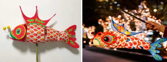 鱼灯是中国传统民俗舞蹈道具,多呈鲤鱼形状,常用竹篾扎制骨架,糊裱棉纸或白布并彩绘鱼鳞纹样,内设蜡烛或LED灯源,分头、身、尾三节可转动,常见款式包括鲤鱼、鳜鱼等,舞动时可摆出“鲤鱼摆尾”“鱼跃龙门”等套路 。其名称谐音“余”,象征丰收吉祥,广泛用于元宵巡游、祭祀庆典等活动,表演形式含方阵、八卦阵等队形变化.