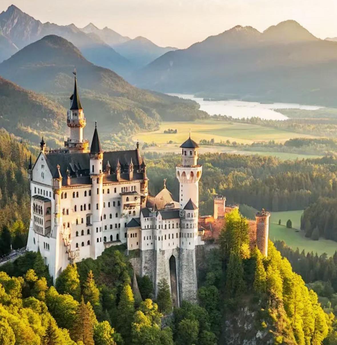 【新天鹅堡】(外观,游览时间不少于15分钟)始建于1869年,位于德国南部边境小城福森近郊群峰的一个小山峰上,因拥有童话般的外观以及与周围湖光山色融为一体的靓丽风景,成为德国的旅游名片。