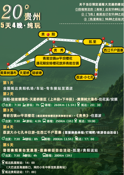如当日预定有返程大交通,为免耽误大交通时间,回程预定的高铁应在17:00以后。飞机航班应订在17:30之后。也可以送凯里南站14:30之后站次。