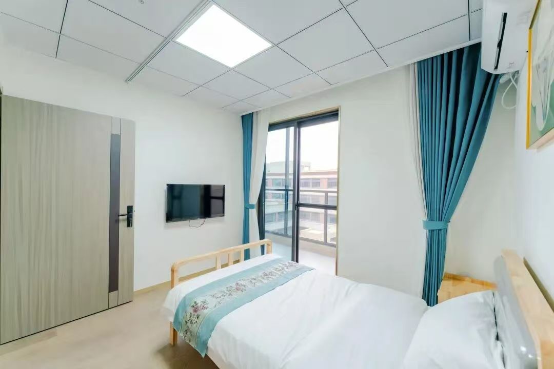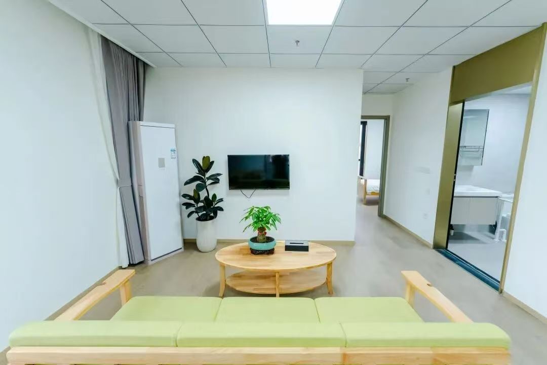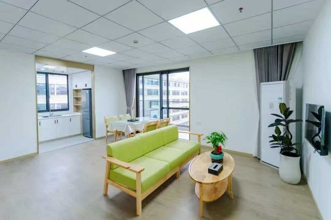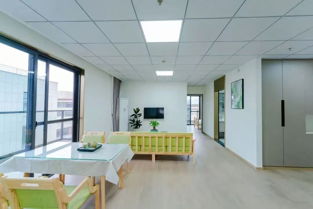走进公寓内部,空间布局合理,温馨舒适。现代化的装修风格简约而不失精致,从柔和的灯光到环保的建材,每一处细节都彰显着对长者的关怀。适老化细节更是无处不在,公共区域地面全部采用防滑纹理地砖,并在卫生间、楼梯转角等易滑区域增设夜光防滑条;走廊两侧安装了连续的 L 型扶手,拐角处进行圆弧处理,避免磕碰风险。每间卧室堪称智能安全的温馨港湾:床头配备紧急呼叫系统,采用一键式大按钮设计,即使视力不佳的长者也能轻松操作;防跌倒雷达 24小时监测活动轨迹,一旦感应到异常姿势即刻报警;智能感应夜灯在夜间有人起身时自动亮起,柔和光线不刺眼;床边还预留了医用吸氧接口,淋浴间内L型扶手、折叠座椅、防滑地垫一应俱全,全方位保障洗浴安全。