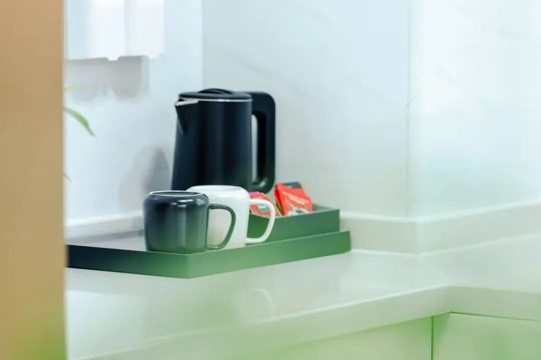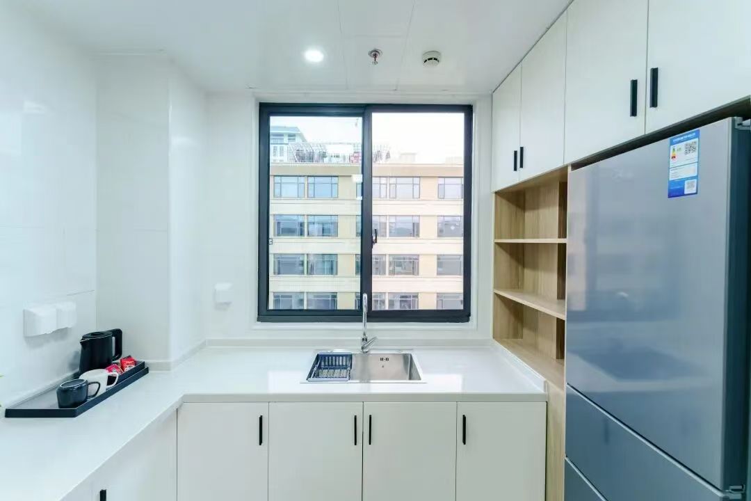 厨房内,洁白的橱柜与台面干净整洁,设施一应俱全,操作便捷且安全,长者们可以在此一展厨艺,烹饪出记忆里家的味道。