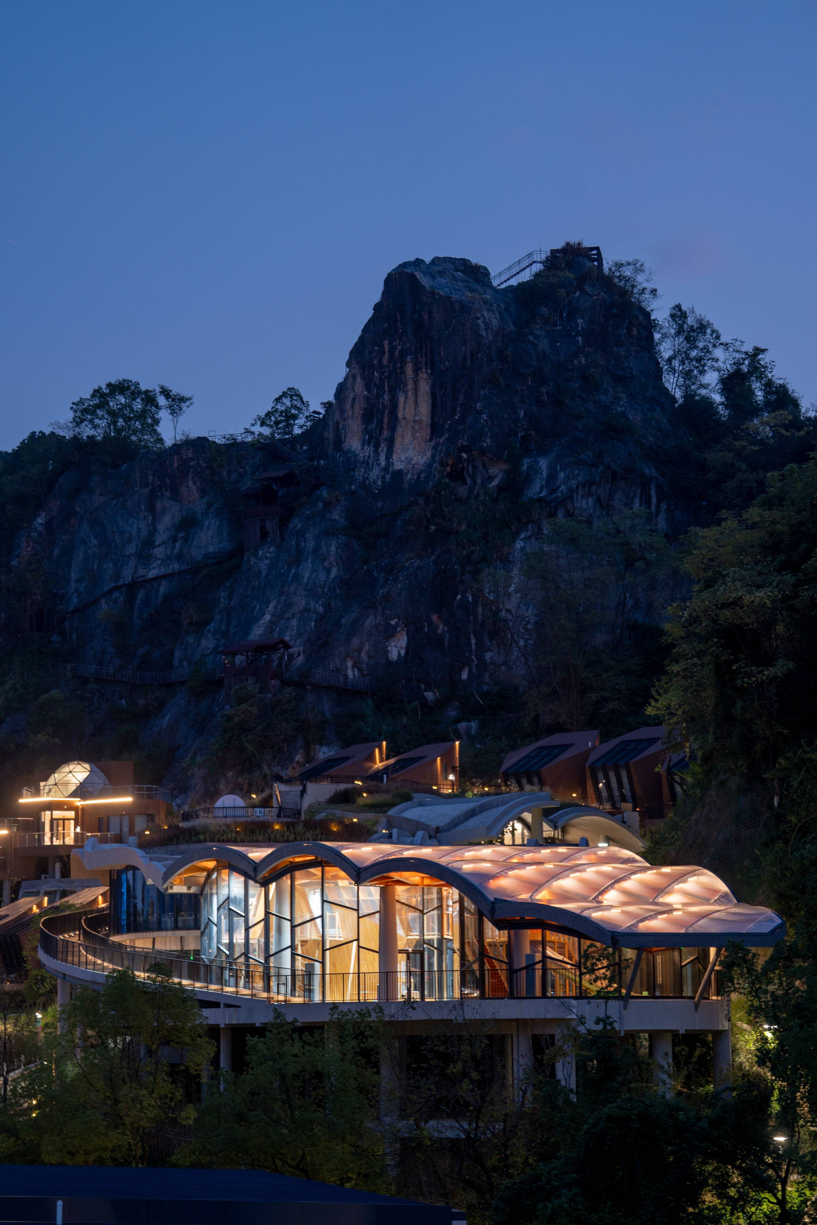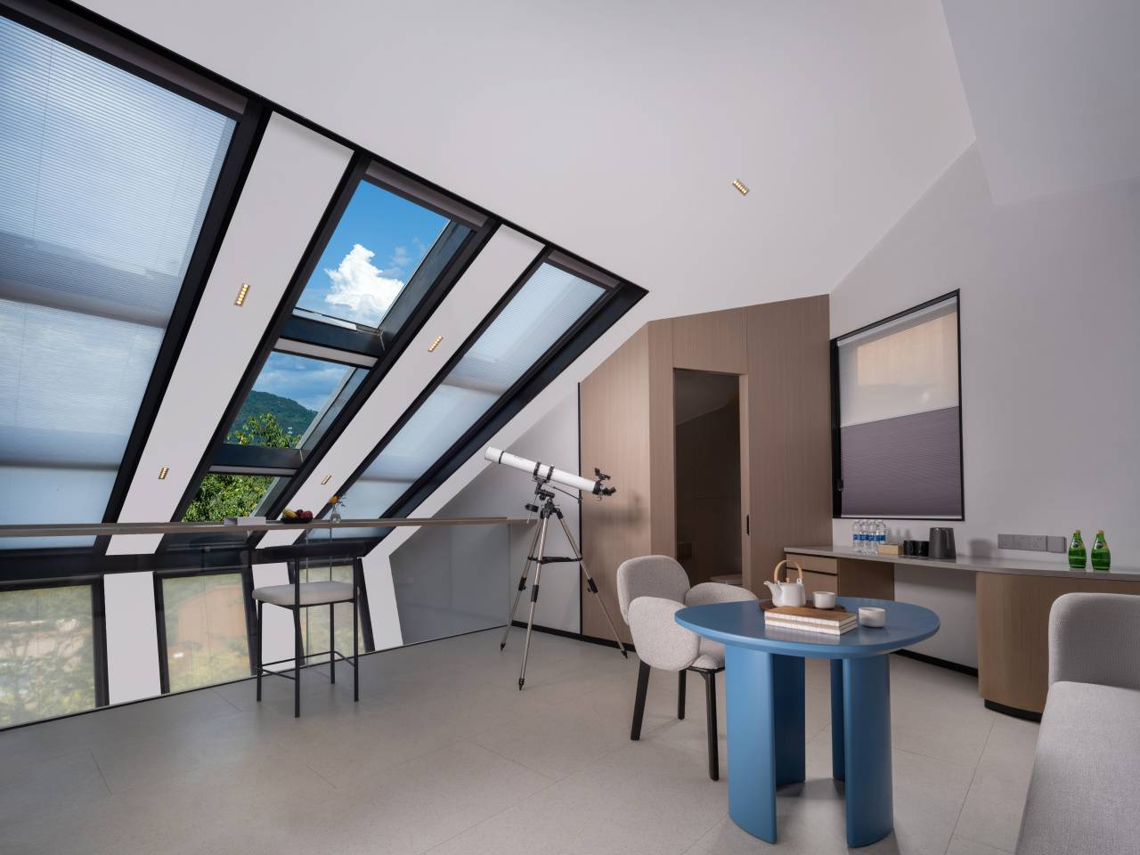 天文台客房悬于岩壁之上,透过窗户将星空与山色引入室内,抬头便可看山居夜色与星光点点,在部分客房还配置着天文望远镜。夜晚躺在舒适的大床上,枕着星光入眠。
