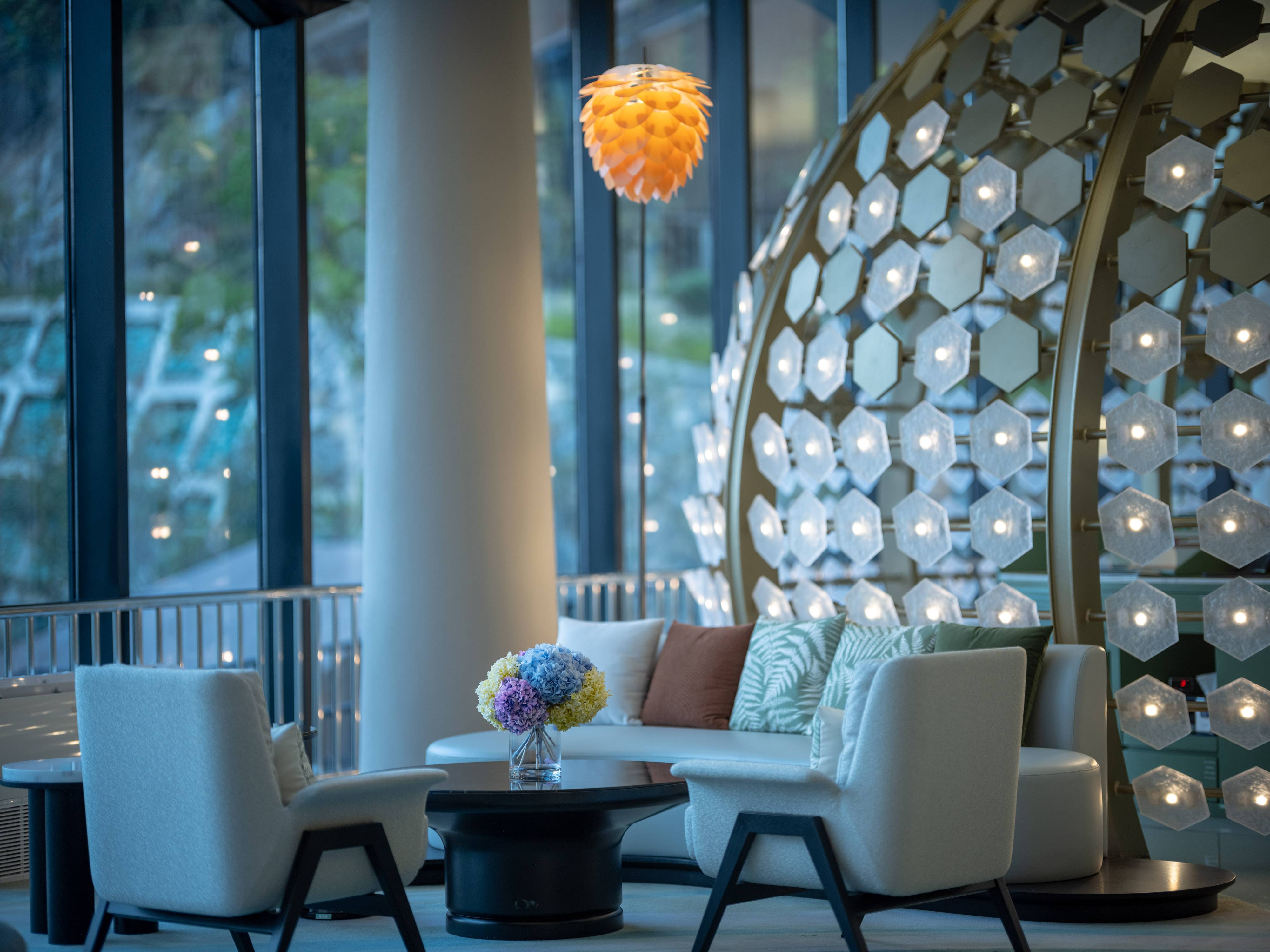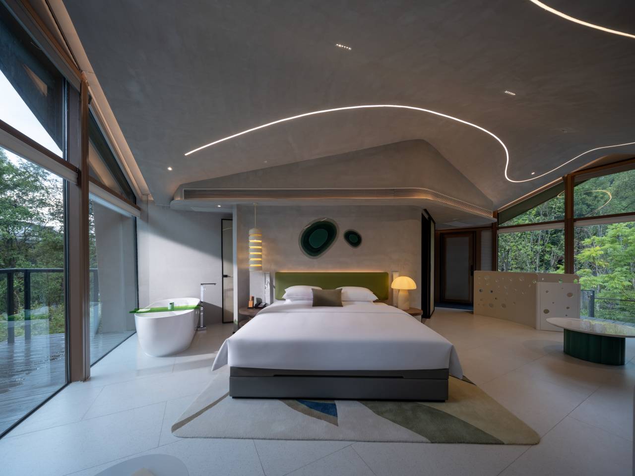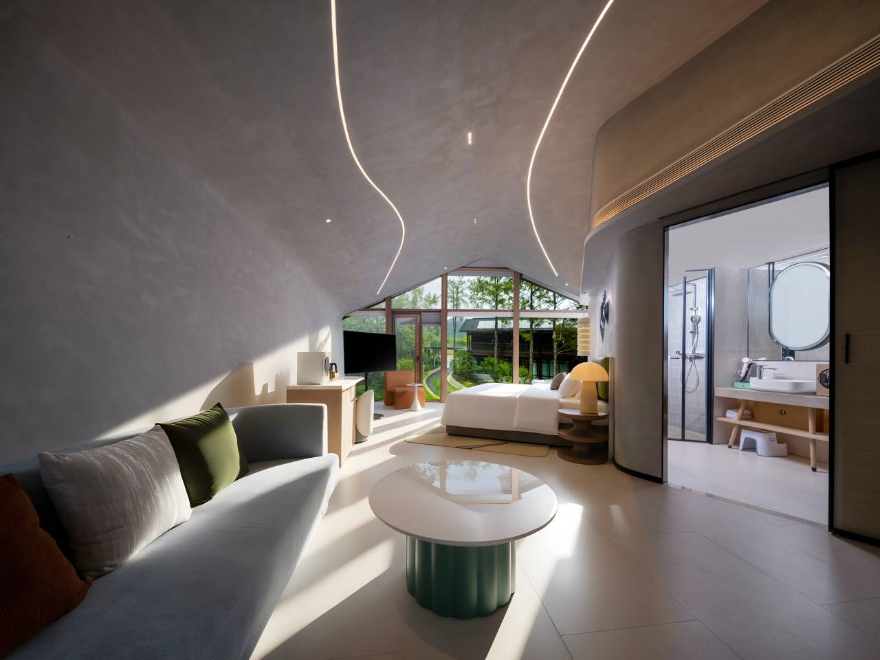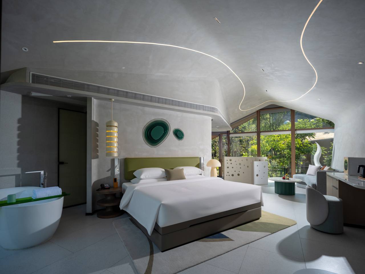 结合其独特的自然环境,打造出室内外儿童乐园、登山步道、粉色栈道及溶洞咖啡等休闲体验场景,同时还配备着汤泉泳池中心、文化街区和撸猫馆等互娱空间;酒店希望创造一个拥有自然美感与纯粹欢乐的全年龄段的度假胜地。
