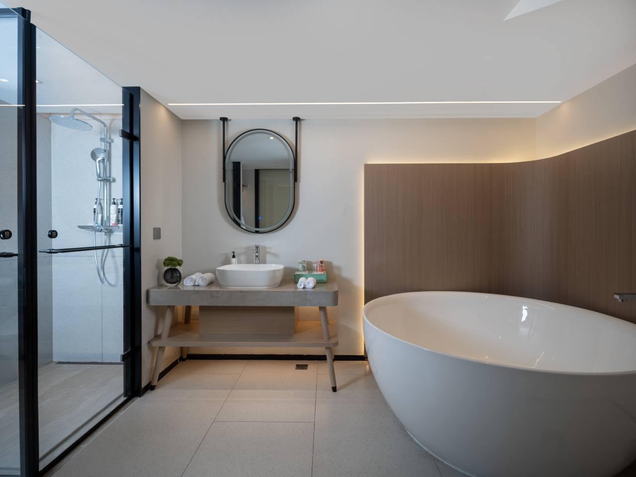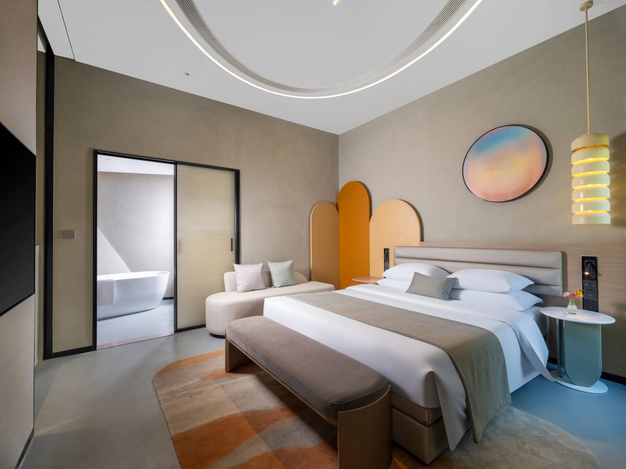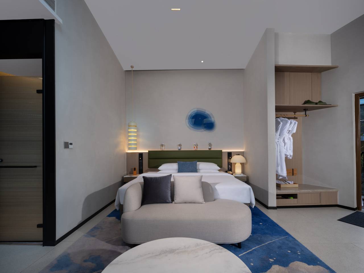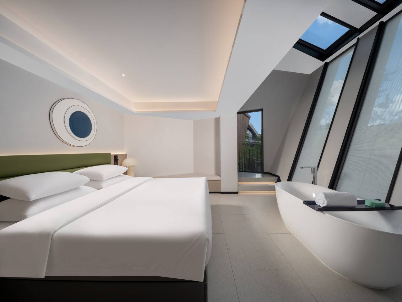 结合其独特的自然环境,打造出室内外儿童乐园、登山步道、粉色栈道及溶洞咖啡等休闲体验场景,同时还配备着汤泉泳池中心、文化街区和撸猫馆等互娱空间;酒店希望创造一个拥有自然美感与纯粹欢乐的全年龄段的度假胜地。
