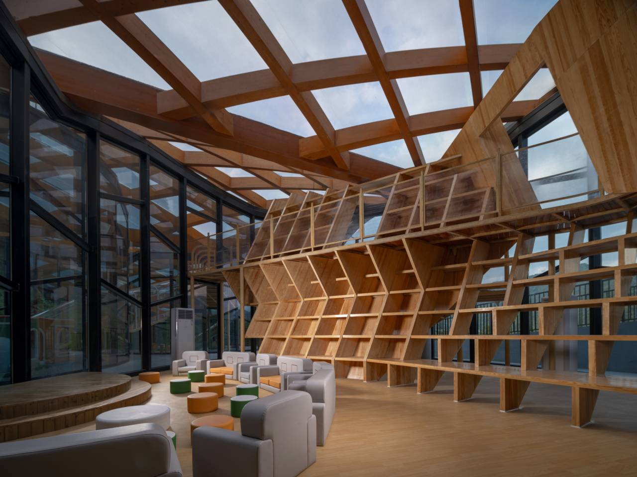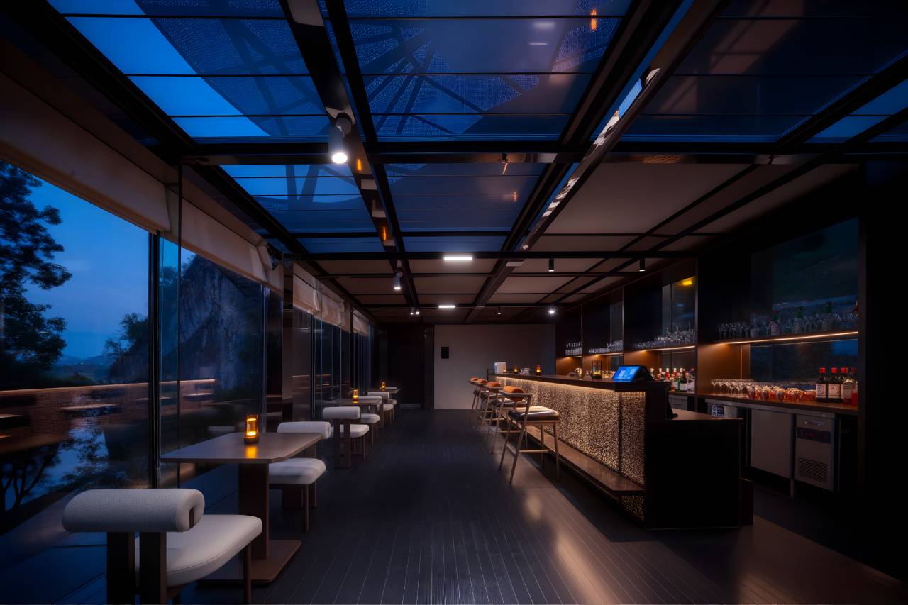 竹瘾酒吧的顶棚以桐庐非遗传统文化之一竹编设计而成,360°落地窗,引入窗外无边美景,黄昏、日落、渐次暗下的日暮就是最好的酒酣伴侣。
