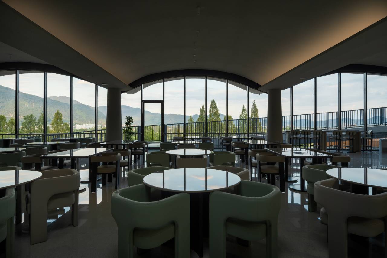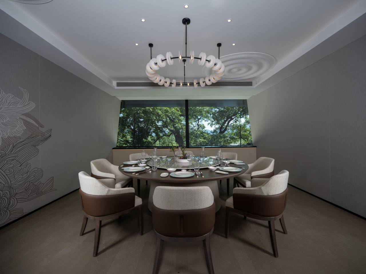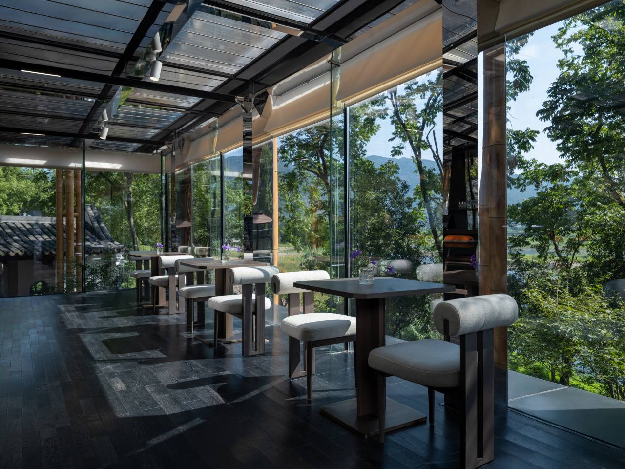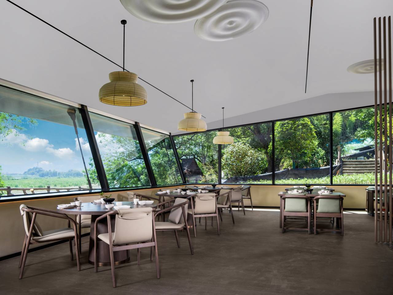 “过云”二字取自唐代杜甫《雨四首二》,意指在云中穿行或飞过的云,生动形象的体现出餐厅建筑海拔高,景观无敌。过云餐厅作为酒店的全日制餐厅。这里不仅提供中西式自助早餐,更将山间云雾请入窗景。于餐座旁推窗远眺,颇有“今日过云迟”的山水意境,为宾客营造出置身云端的独特用餐体验。