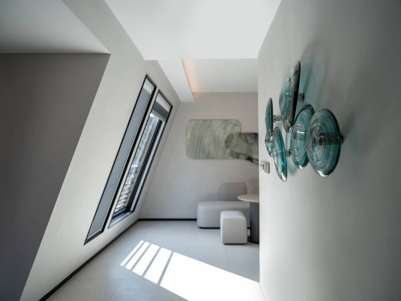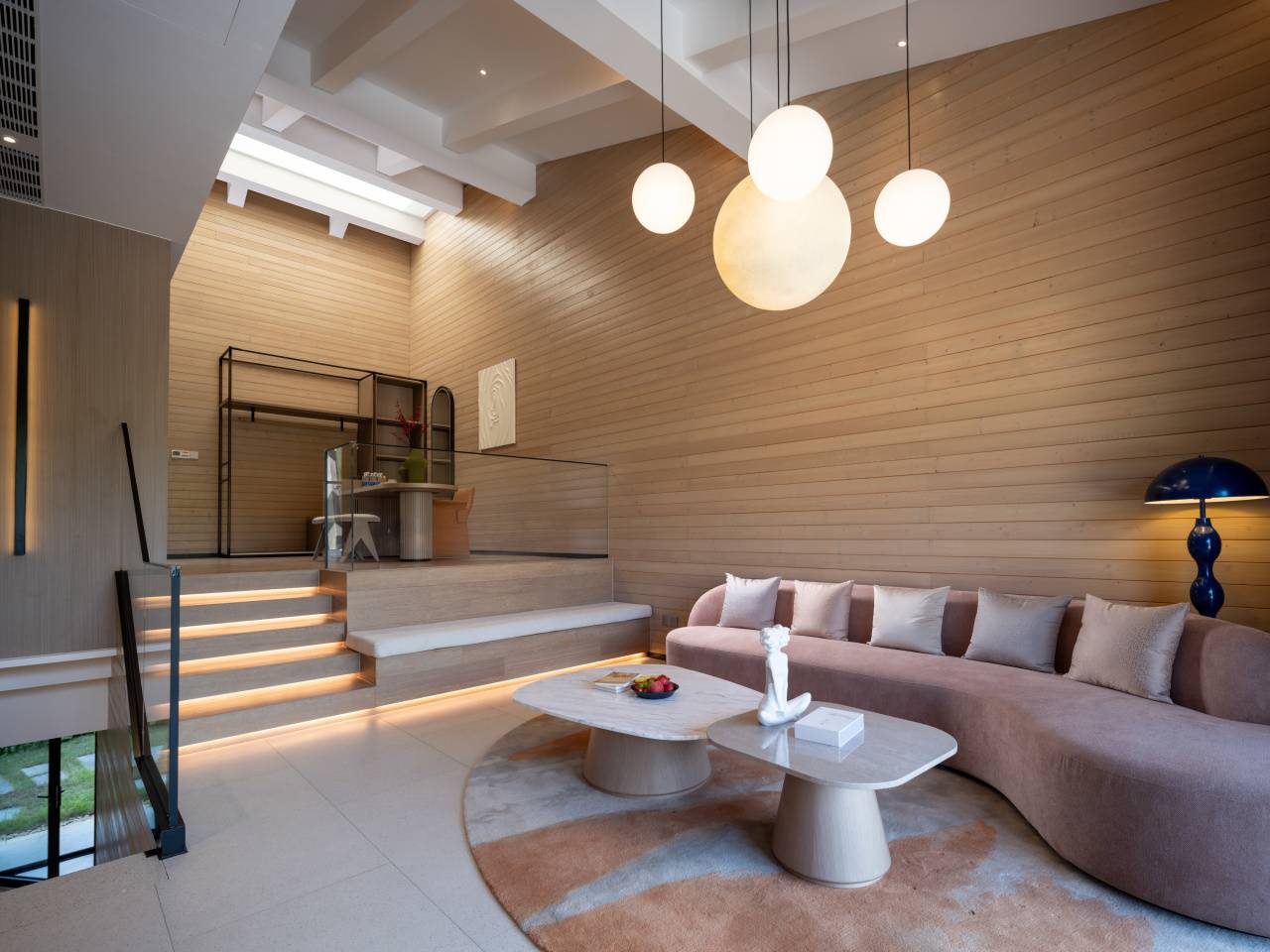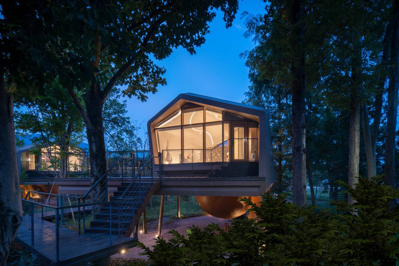 海螺屋隐于林间,螺形的建筑结构呼应着自然界的黄金比例,每个海螺屋都藏有一个独特小空间,室内高级灰色调与软装陈设,营造出艺术包裹的氛围感。