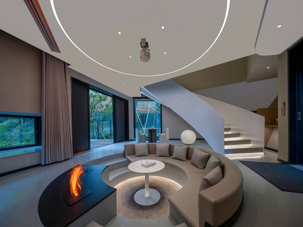 炭晶舍则以极简设计诠释野性美学,通体漆黑入墨,下沉式结构赋予居住独特的包裹感,壁炉燃起,光影在墨色空间内摇曳,自成一方静谧天地。
